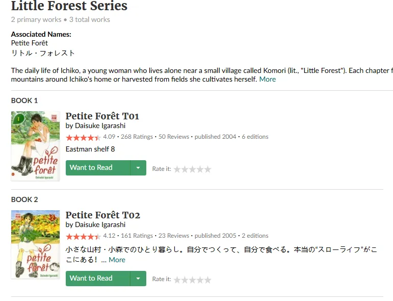 | Little Forest | Soulful | Solo cooks | Seasonal recipes harvested from the forest. | Goodreads | 7.11 |