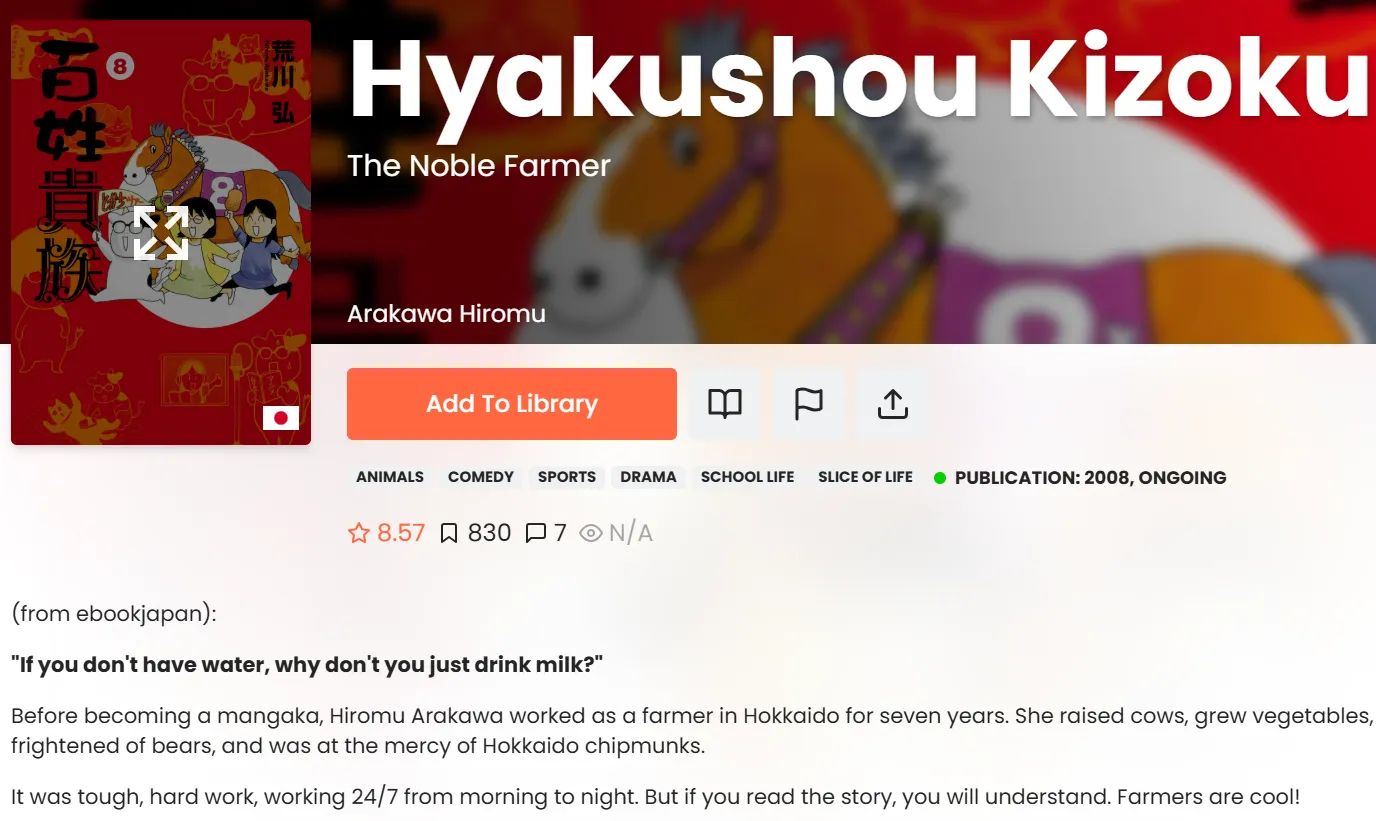 | Noble Farmer | Humorous | Realists | Hiromu Arakawa’s real-life farm stories (hilarious). | Mangadex | 7.40 |