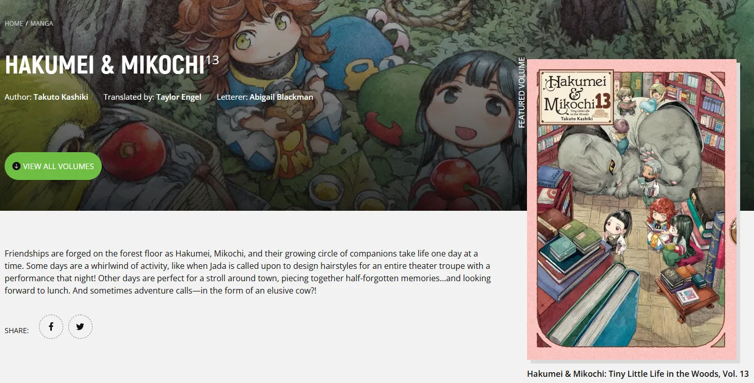 | Hakumei and Mikochi | Whimsical | Tiny-world fans | Two 9cm tall girls living in a tree. Pure magic. | Yen Press | 8.14 |
