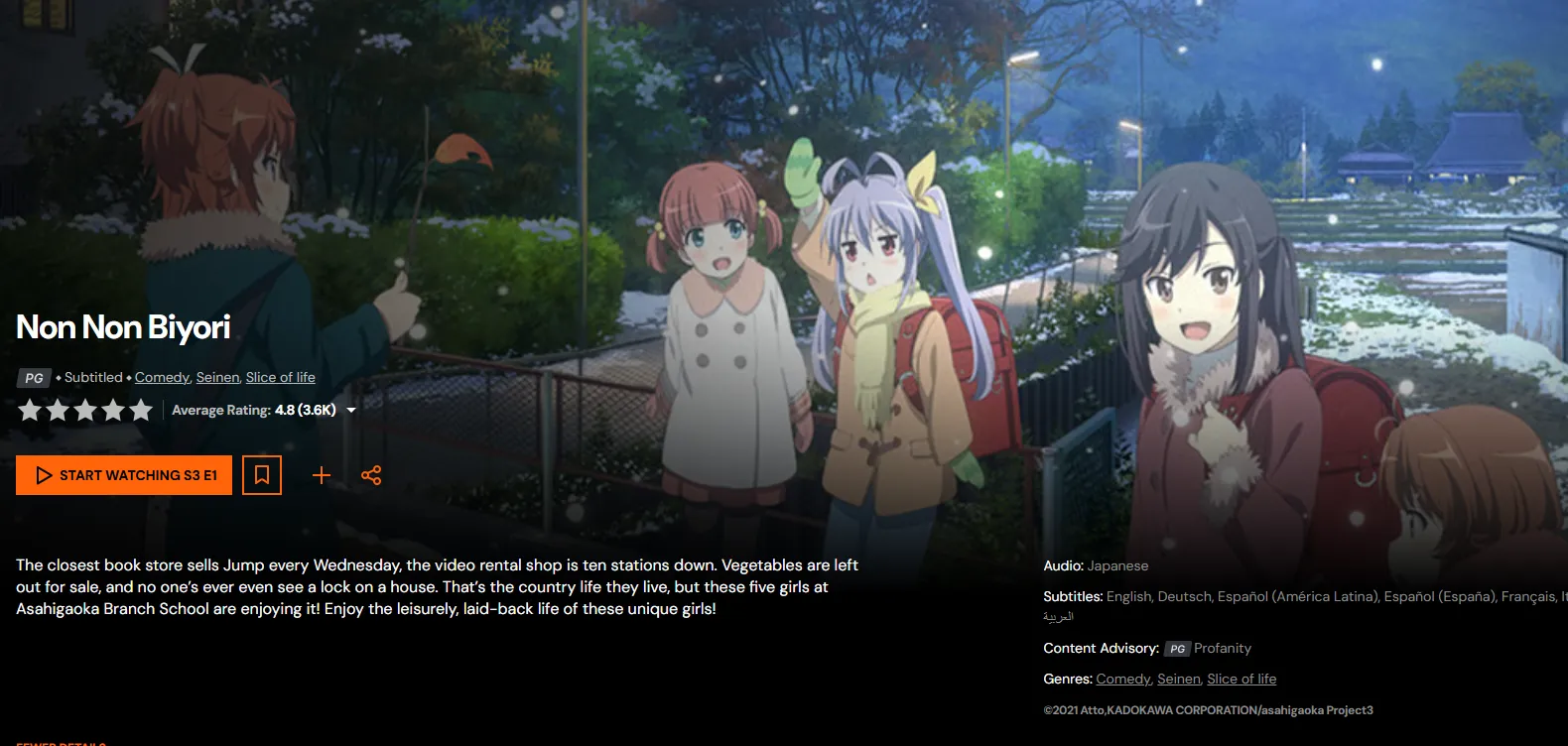 | Non Non Biyori | Pure Peace | Burnout relief | The legendary "Nyanpasu!" and eternal summer vibes. | Crunchyroll | 7.94 |