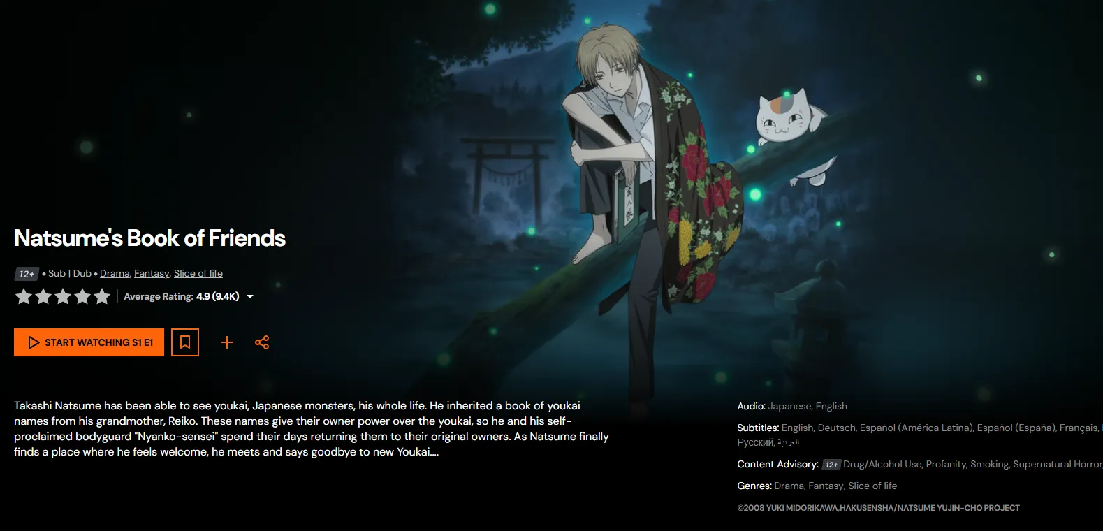 | Natsume’s Book of Friends | Ethereal | Emotional souls | A quiet, misty world of spirits and kindness. | Crunchyroll | 8.30 |