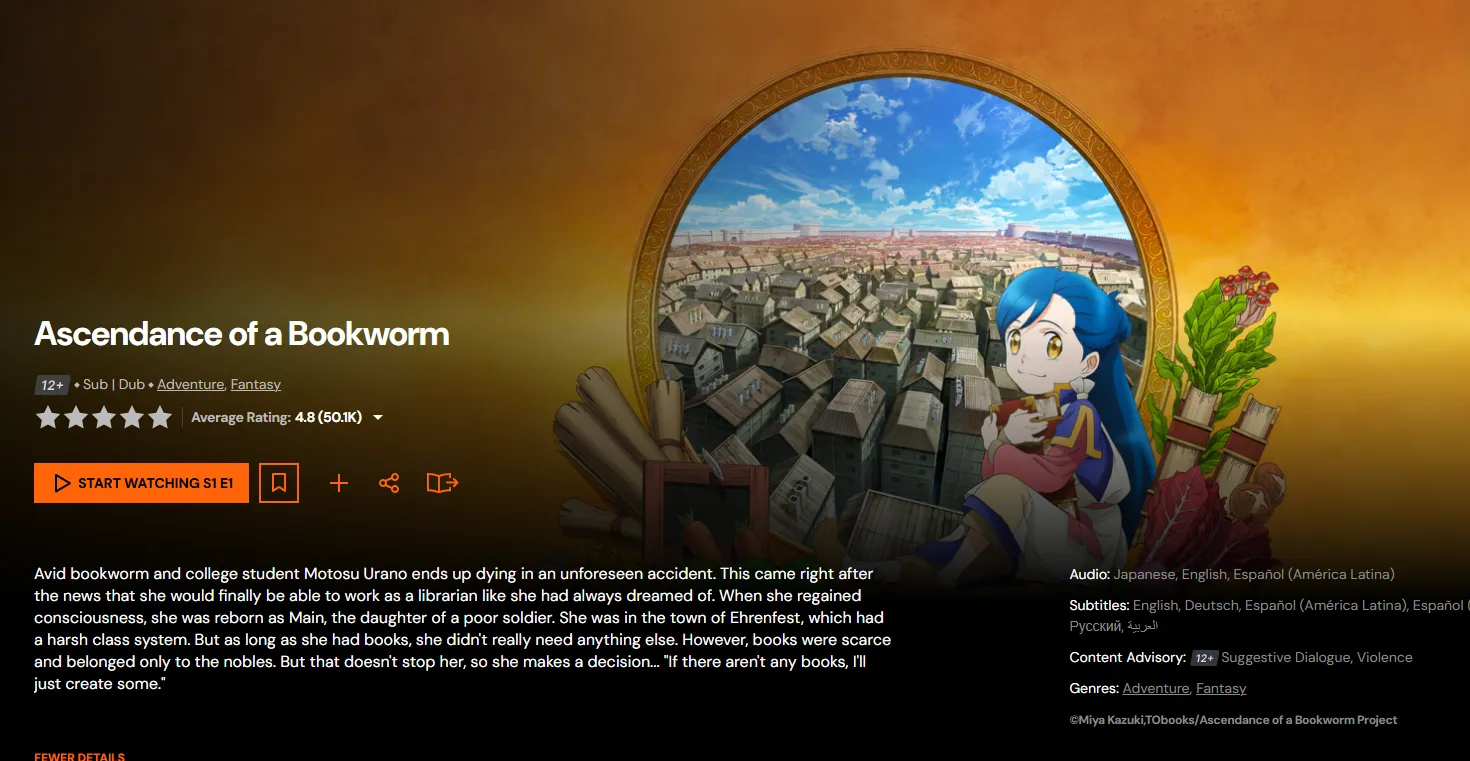 | Ascendance of a Bookworm | Systematic | Bibliophiles | The meticulous process of making paper/books. | Crunchyroll | 7.97 |