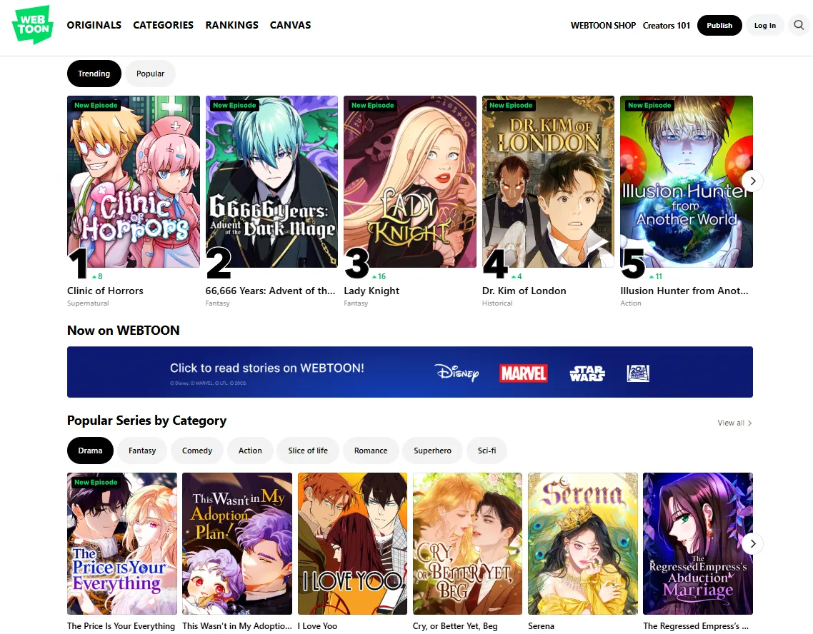 Content & Audience: While featuring global indie creators, Tapas is a major destination for licensed Korean webtoons, especially after its acquisition by Korean conglomerate Kakao. It excels at localizing and promoting Korean romance, fantasy, and BL titles for an international audience, making series like The Beginning after the End bestselling hits overseas.