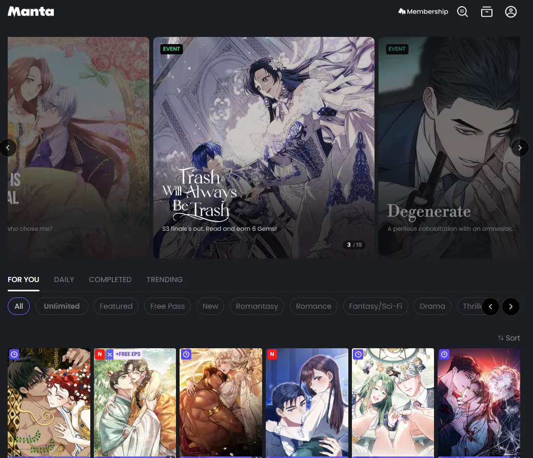 | Manta | 📖 Subscription-based platform focused on Romance, Fantasy, and Slice-of-Life; all chapters unlocked with subscription; clean English interface; binge-friendly. | Subscription ($4.99/month) |
