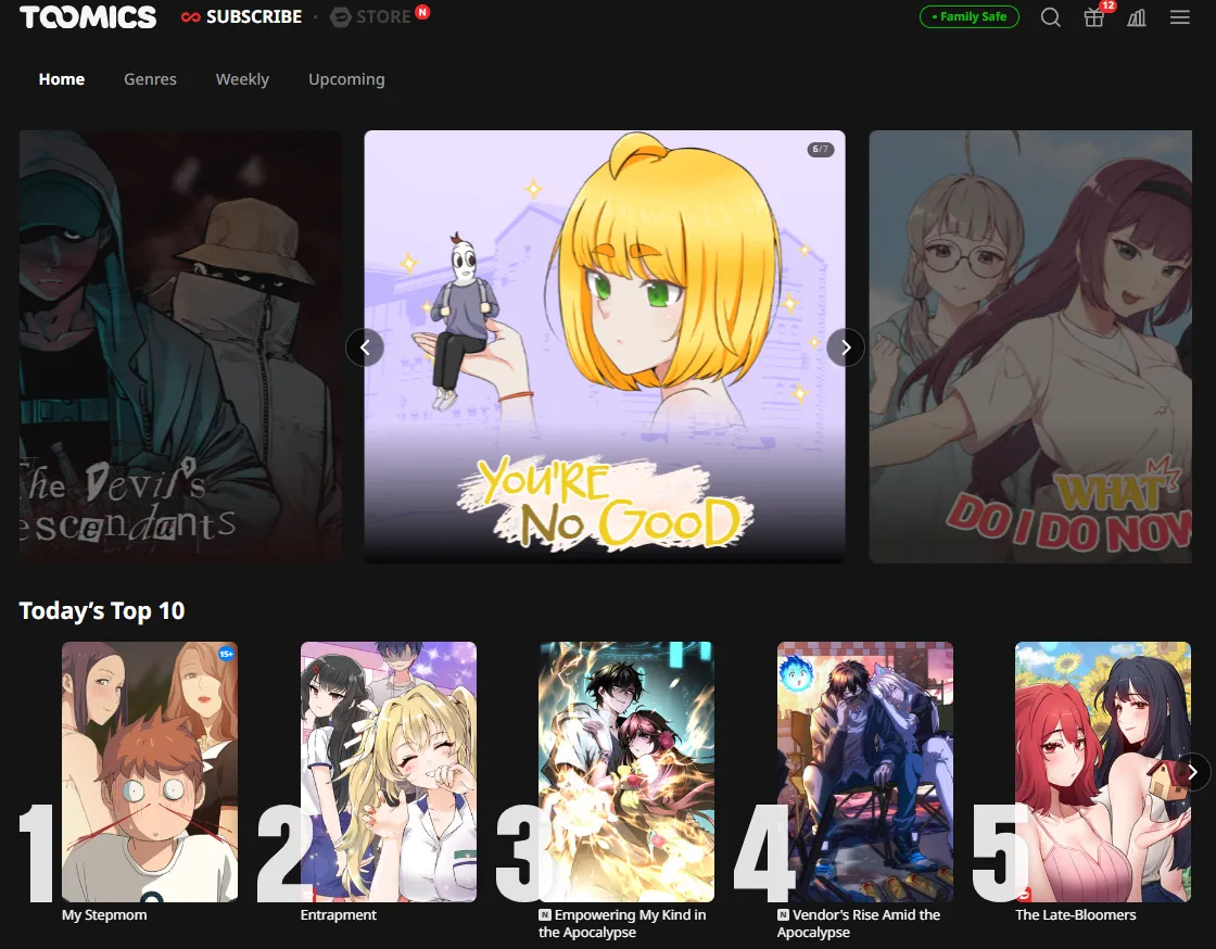 A major Korean webtoon platform with a vast library, Toomics offers a wide array of comics, with a significant portion geared towards adult readers, featuring action, thriller, and mature romance/drama genres.