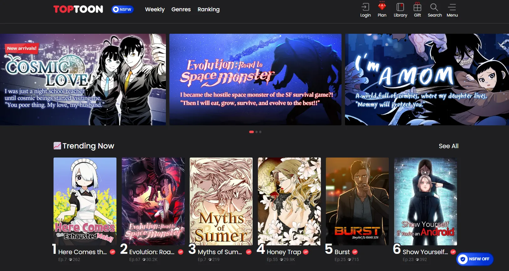 6. For Readers Who Want “The Korean Original Experience”, TOPTOON is best for you. Its English site is a direct window into one of Korea’s largest webtoon portals, especially for adult (19+) content across all genres.