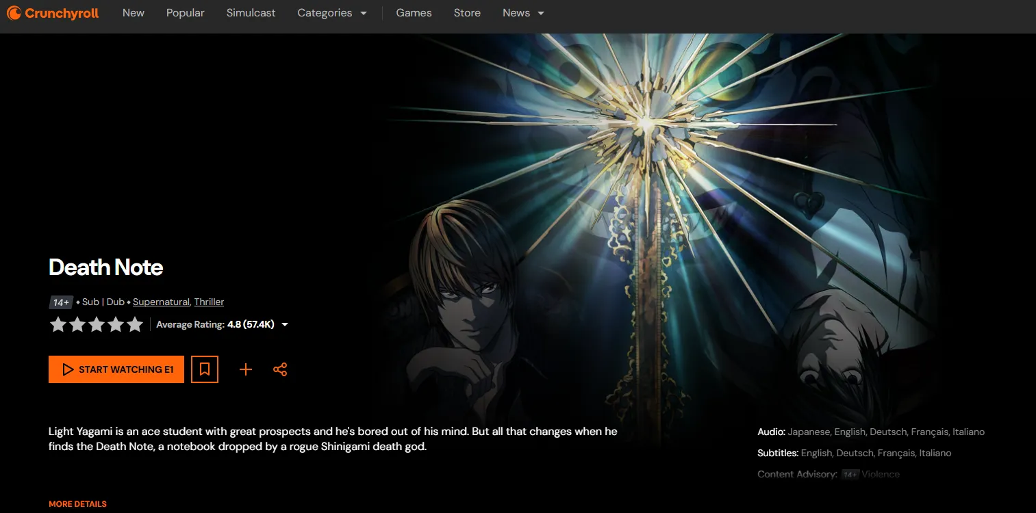 Basic Overview:Netflix remains the most reliable and user-friendly platform for experiencing the Death Note franchise globally. Its greatest strength lies in its robust multi-language ecosystem, allowing viewers to seamlessly switch between Japanese audio, professional English dubs, and several other regional voice tracks (such as German or French). Complemented by high-quality official subtitles in dozens of languages, it provides the most accessible entry point for international fans. Beyond the original 37-episode anime, Netflix is also the exclusive home of the 2017 US Live-Action Movie.