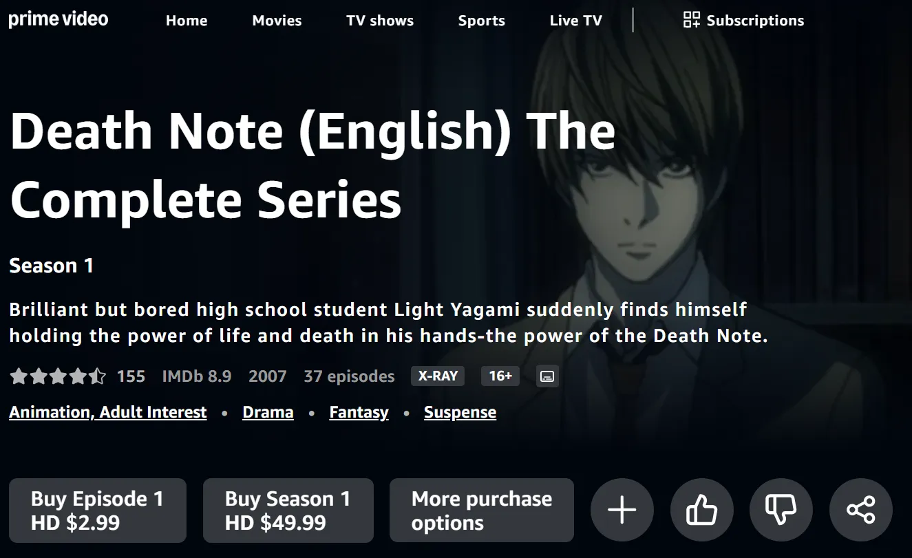 Basic Overview:Amazon Prime Video remains the most versatile platform for Death Note fans, offering a unique hybrid of subscription streaming and a massive digital storefront. While streaming licenses on other platforms often fluctuate, Amazon's "Buy" and "Rent" options provide the ultimate insurance against content disappearing. It is particularly renowned among "考据党" (hardcore researchers) as the primary place to find high-quality digital versions of the 2006 Japanese Film Trilogy and the Relight special editions, which are rarely included in standard streaming libraries.