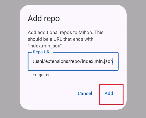 7) A dialog box will appear asking for the repository URL. Carefully paste the following URL: https://raw.githubusercontent.com/keiyoushi/extensions/repo/index.min.json, and tap Add to confirm.