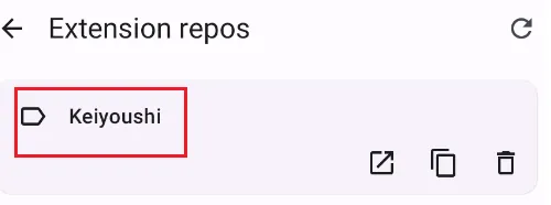 7) After tapping Add, the dialog closes and the Keiyoushi repository appears in your Extension repos list. You should see its name and URL. No error messages should appear.