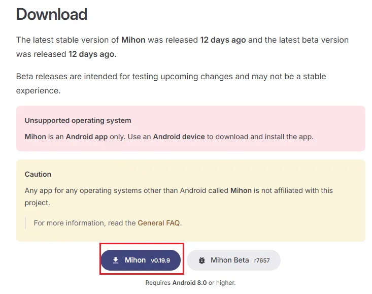 2) Download the latest stable version: mihon-v0.19.9.apk (as of April 2026)