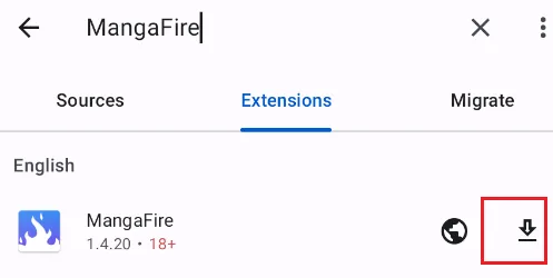 2) Find an extension you want (start with MangaFire or MangaBuddy for English manga), and tap Install next to the extension name.