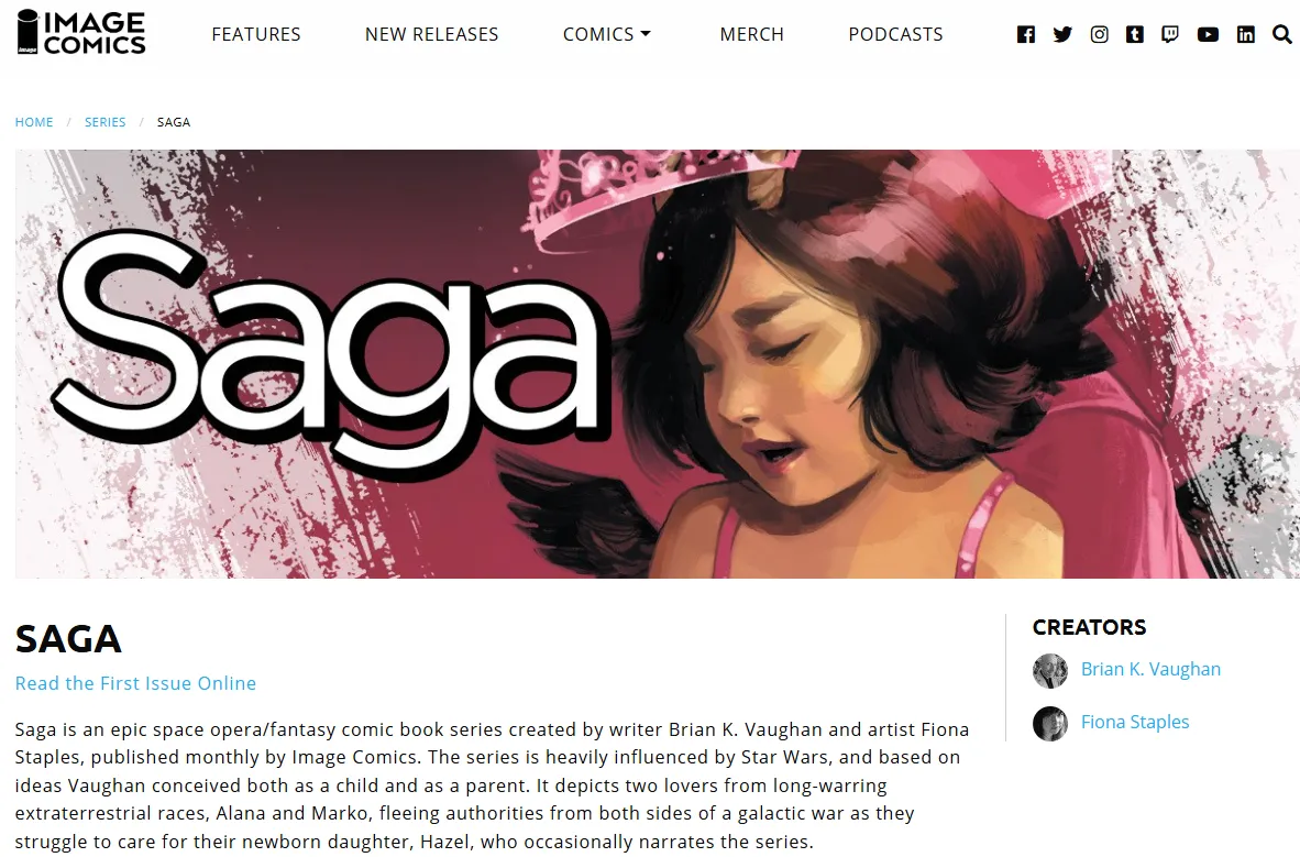 Synopsis: Saga follows Alana and Marko, star-crossed lovers from opposing interplanetary races, as they flee their warring civilizations while raising their newborn daughter, Hazel. Pursued by bounty hunters and navigating political conspiracies, they struggle to protect their family and survive in a vast, imaginative universe. Along the way, the story explores themes of love, parenthood, loyalty, and the costs of war, blending high-concept sci-fi with deeply personal storytelling.