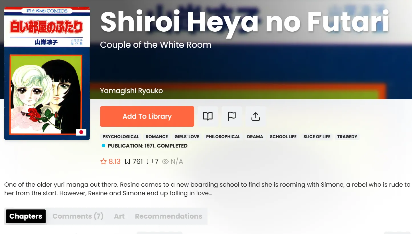 | Shiroi Heya no Futari | Yuri / Drama | The first Yuri manga; a tragic boarding school tale. | Mangadex | 6.95 |
