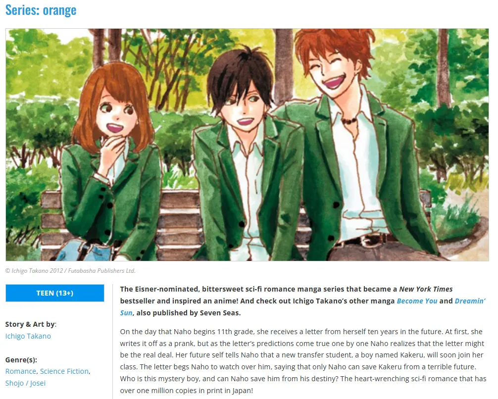 | Orange | Sci-Fi / Romance | Preventing tragedy via future letters; handles depression. | Seven Seas | 8.28 |