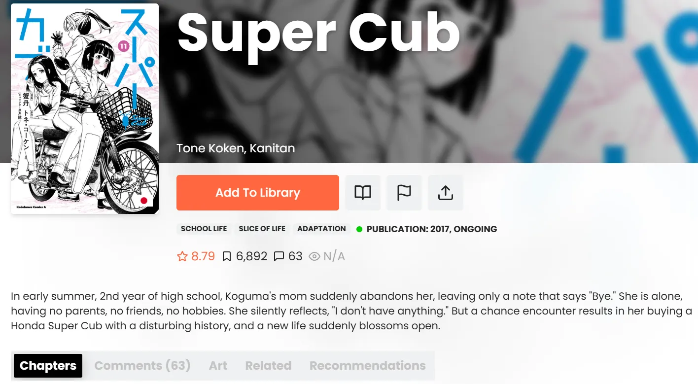 | Super Cub | ★★★★☆ | Minimalist solo life centered around a motorcycle and quiet freedom. | Mangadex | 7.56 |