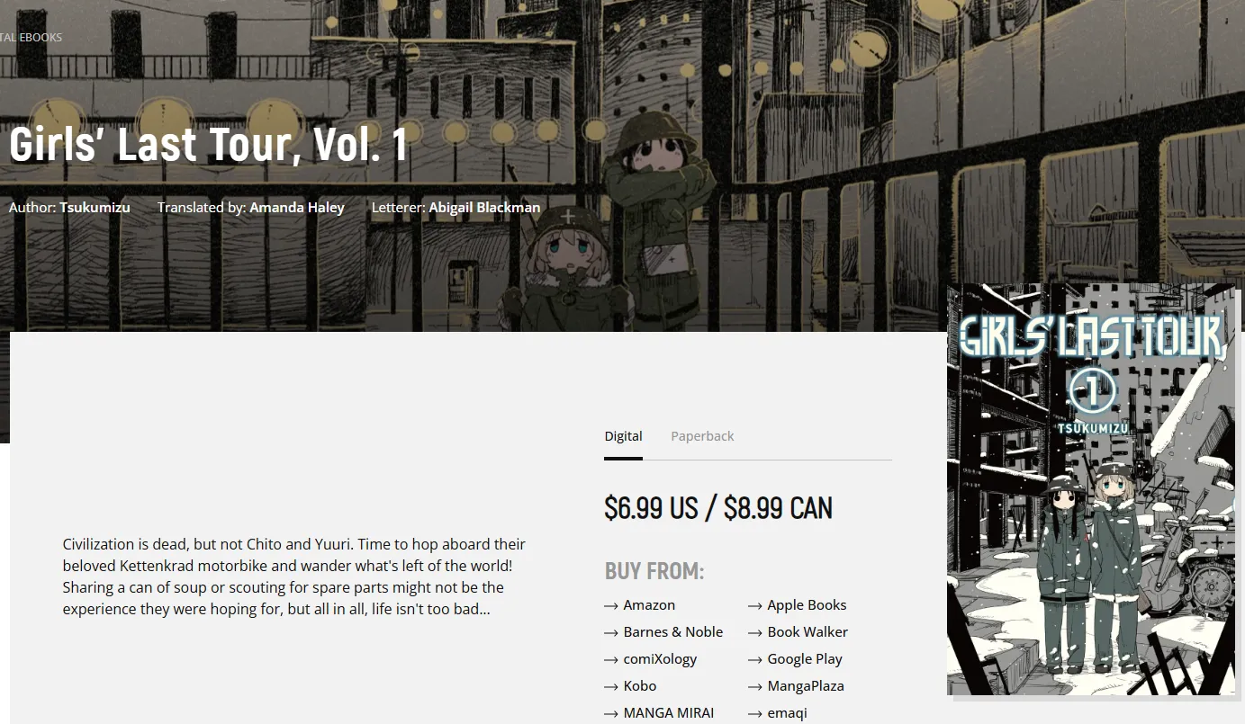 | Girls' Last Tour | ★★★★★ | A peaceful journey through a silent ruined world with deep existential calm. | Yen Press | 8.74 |