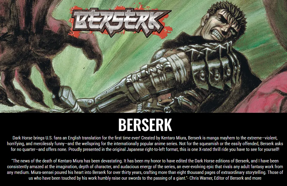 | Berserk | Guts | Ink-Heavy Despair: The crushing shadow of his giant sword. | Art God | Dark Horse | 9.46 |