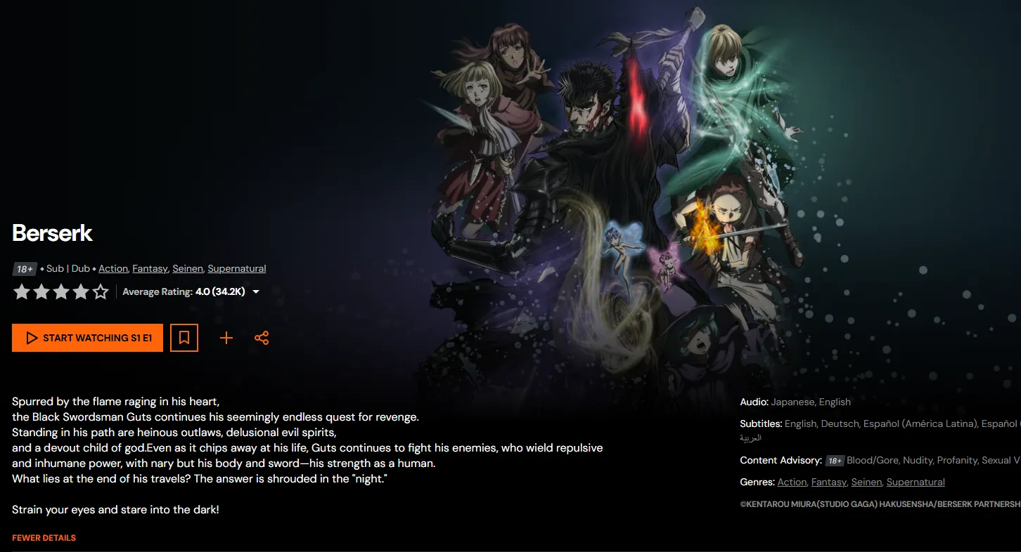 | 1997 | Berserk (Original) | The definitive dark fantasy tragedy. The heart of the genre. | Crunchyroll | 8.61 |