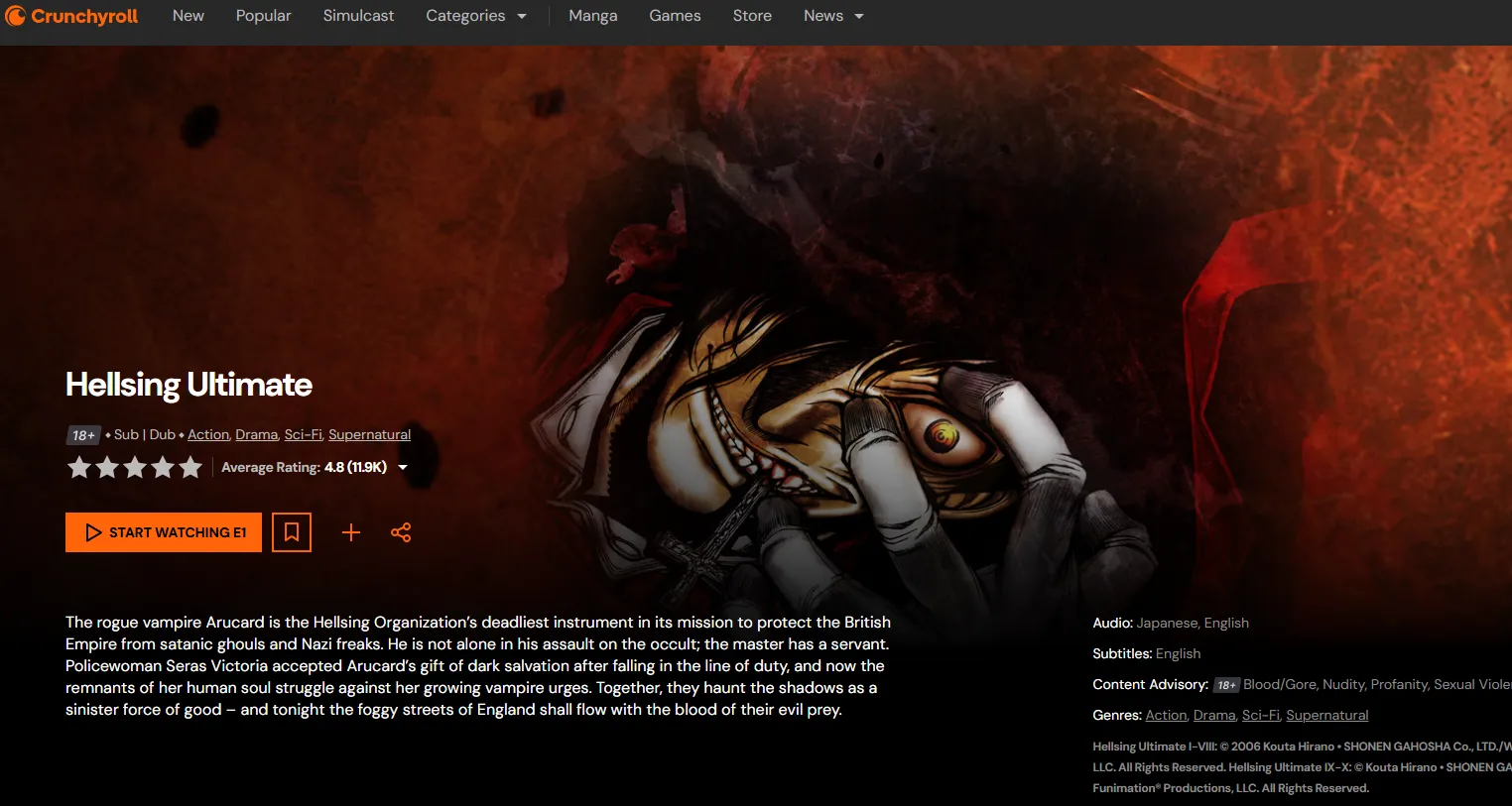 | 2006 | Hellsing Ultimate | A stylish war between vampires, Nazis, and the Vatican. | Crunchyroll | 8.34 |
