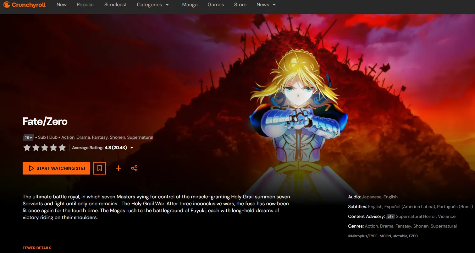 | 2011 | Fate/Zero | A nihilistic battle royale where every wish leads to ruin. | Crunchyroll | 8.26 |