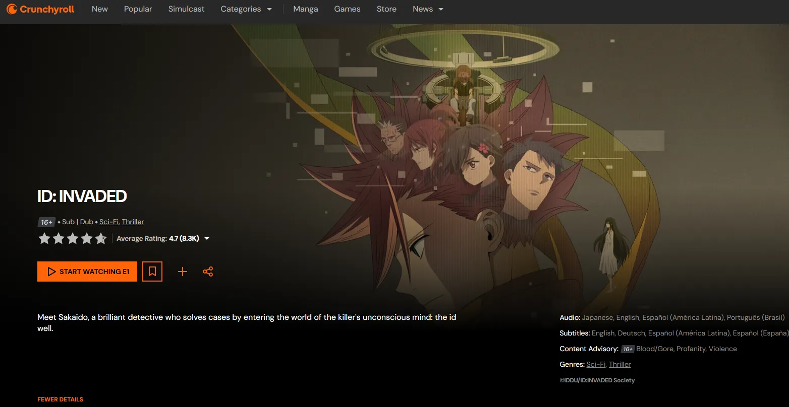 | ID: INVADED | Subconscious Noir | Entering the "Id Wells" of killers to catch serial criminals. | Crunchyroll | 7.81 |