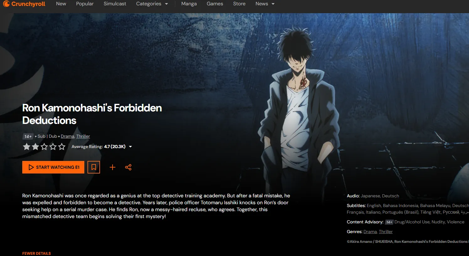 The Plot: Ron Kamonohashi was once the top student at BLUE, the elite detective academy, but he was banned from detective work because of a "fatal flaw": his deductions are so sharp and psychologically crushing that they subconsciously drive every criminal he catches to commit suicide. Living as a shut-in for five years, Ron finally finds a partner in Totomaru Isshiki, a clumsy but pure-hearted police officer. Ron provides the genius deductions in secret, while "Toto" acts as the public face of the investigations.