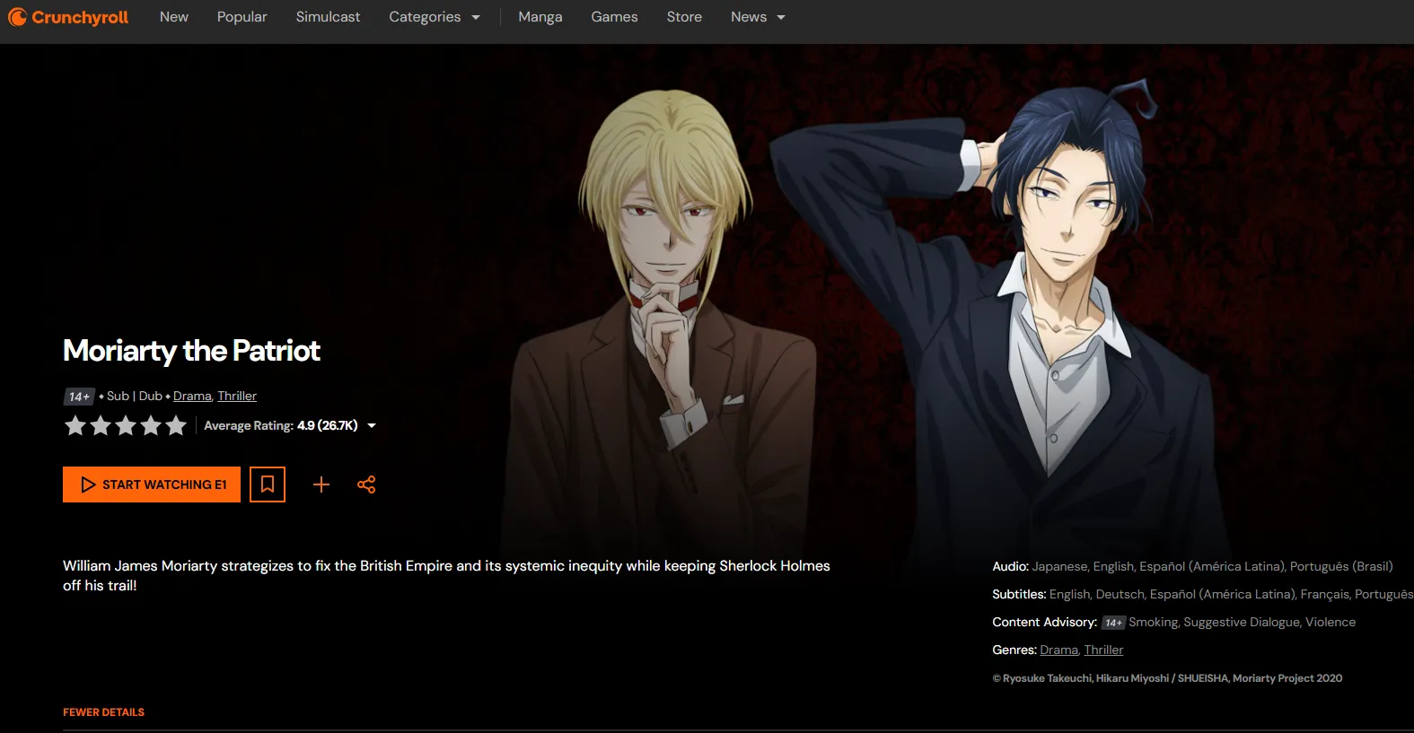 | Moriarty the Patriot | Anti-Hero Scheme | The Sherlock mythos retold from his nemesis's perspective. | Crunchyroll | 8.17 |