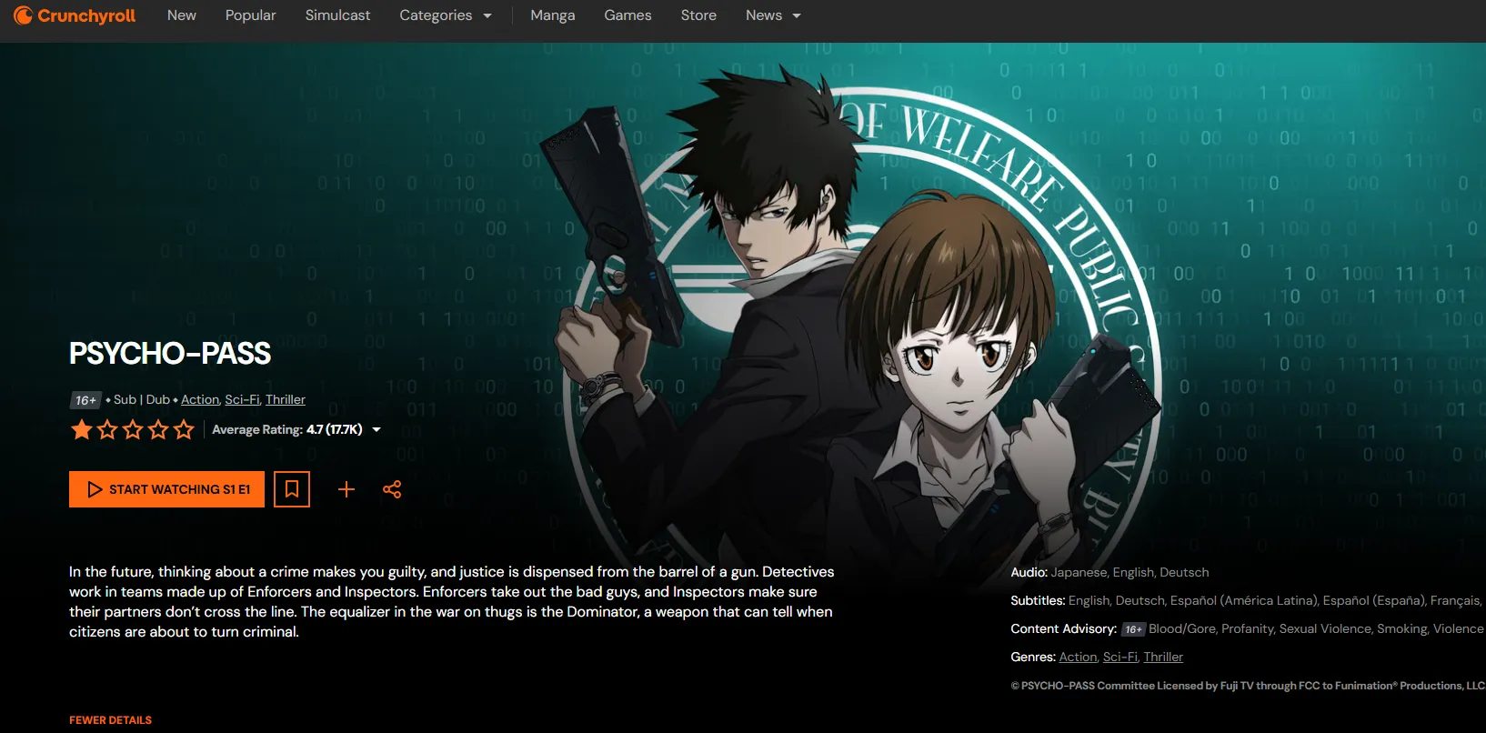 | Psycho-Pass | Dystopian Police | Chasing criminals in a world where crime is predictable. | Crunchyroll | 8.33 |