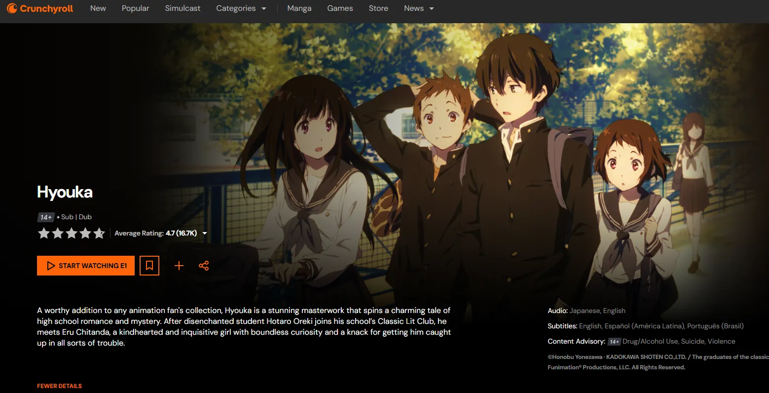 | Hyouka | Soft Deduction | A lazy genius solving club-based school mysteries. | Crunchyroll | 8.05 |
