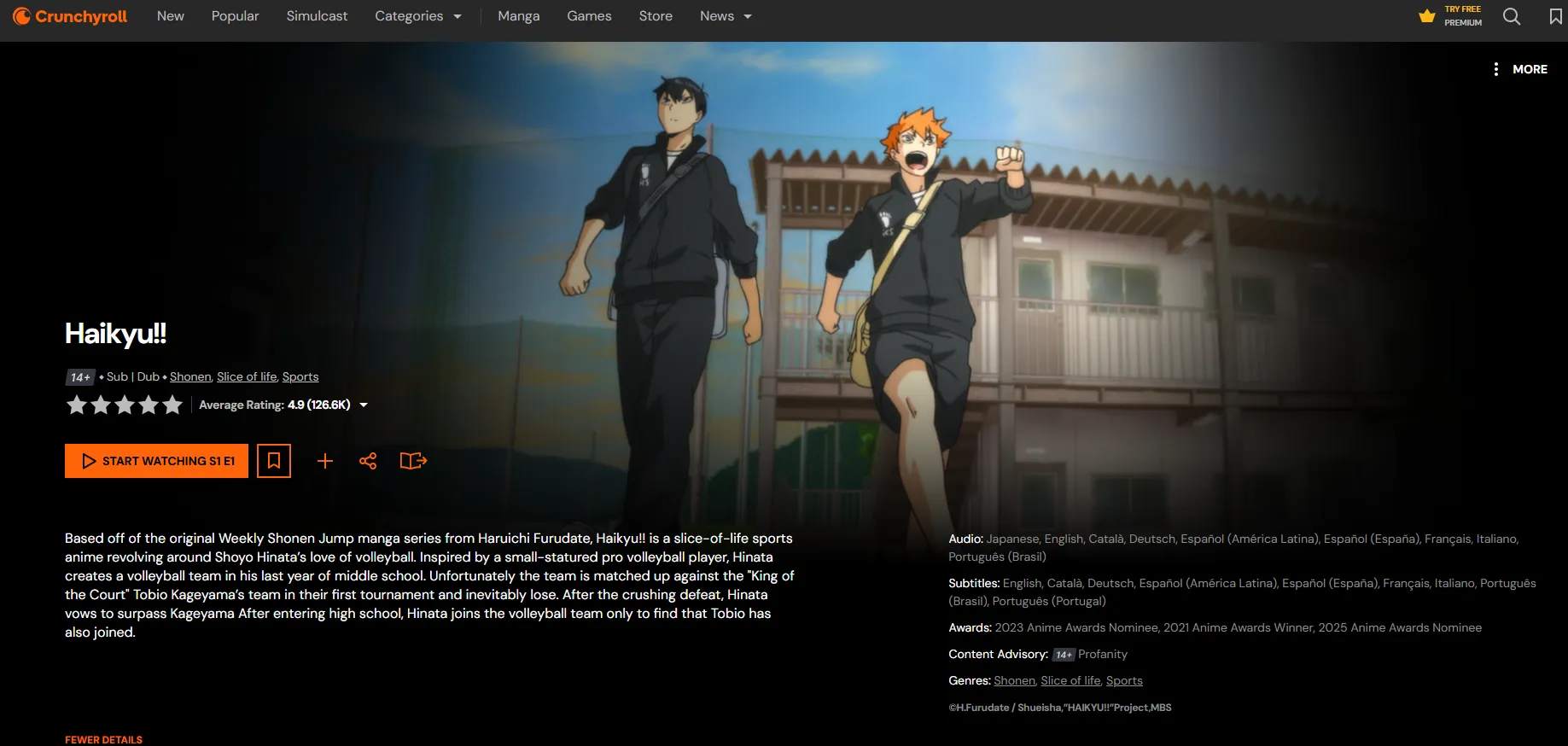 | Haikyu!! | 🏐 Volleyball | The modern ceiling for sports anime; superbly produced with thrilling matches. Masterfully depicts teamwork and individual growth, transforming challenges into sparks of collective belief. | Crunchyroll | 4.9 (126.5k) |
