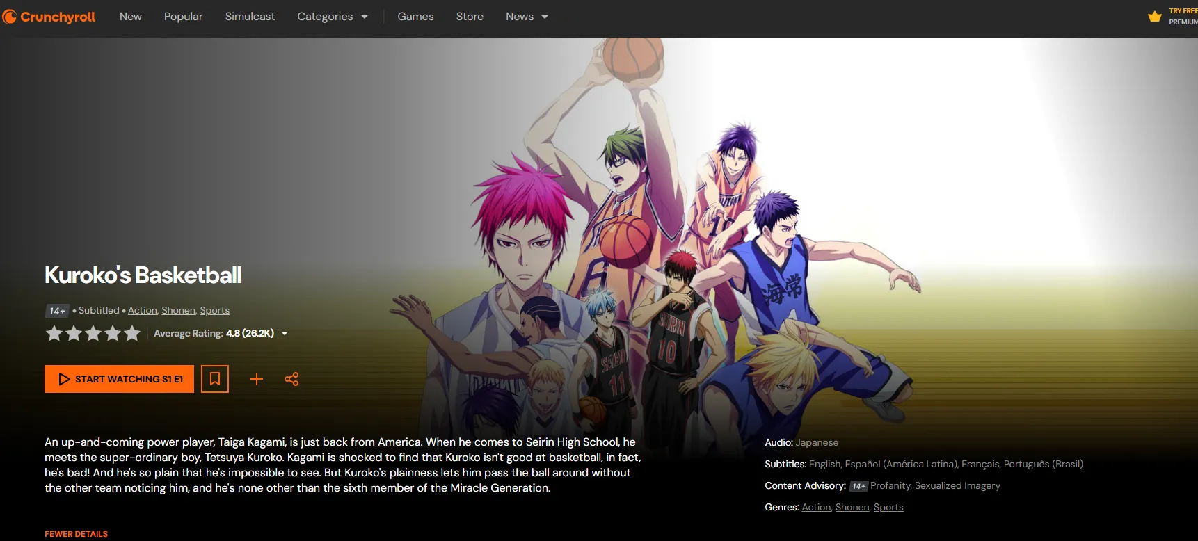 | Kuroko's Basketball | 🏀 Basketball | The apex of "super-powered" basketball with extreme visual impact. Uses flashy, exaggerated abilities and fast-paced confrontation to push basketball to its limits. | Crunchyroll | 4.8 (26.2k) |