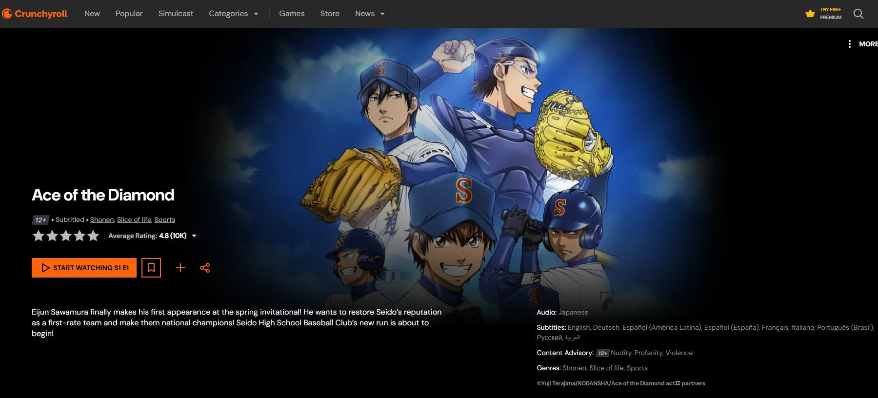 The Premise: Eijun Sawamura, a passionate and unpolished pitcher, enrolls in Seidou High, a prestigious baseball school. Initially underestimated, he must prove himself against highly skilled teammates and rival schools. Through rigorous daily practice, intra-school competitions, and national tournaments, Sawamura hones his pitching technique, adapts to different strategies, and develops his mental resilience. Along the way, he builds strong bonds with his teammates, learns the importance of trust and coordination, and strives to lead his team to victory. The story captures his journey from rookie to ace, filled with intense matches, personal challenges, and the highs and lows of competitive baseball.