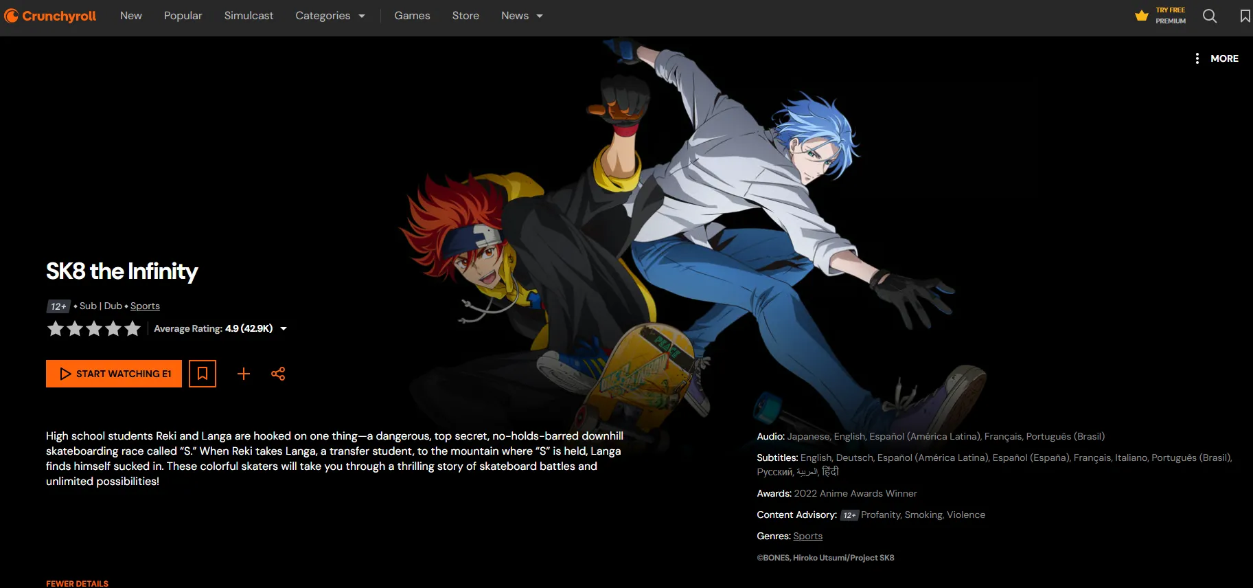 Why It's Great: SK8 The Infinity uniquely blends street skateboarding culture with anime-style action. The series emphasizes adrenaline-pumping races, creative tricks, and dynamic character interactions. Its high-octane visuals and youthful energy make it a thrilling watch, while the themes of friendship, mentorship, and self-discovery give it emotional depth beyond the sport.