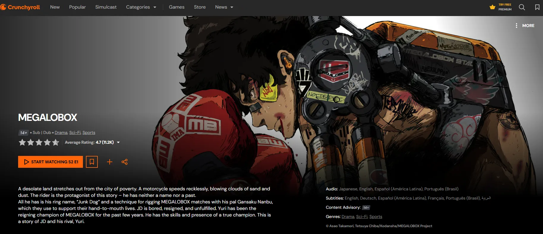 The Premise: Junk Dog, an underground fighter from the slums, participates in illegal Megalo Boxing matches, fighting with a mechanical exoskeleton for survival. Despite his humble beginnings, he earns the chance to compete in the prestigious Megalo Box Championship. Facing top-tier fighters, Junk Dog must hone his skills, strategize against formidable opponents, and confront his past. Along the way, he forms bonds with mentors and rivals, discovering the true meaning of honor, effort, and personal identity. The story chronicles his rise from obscurity to becoming a celebrated boxer, while exploring the hardships and sacrifices of life both inside and outside the ring.