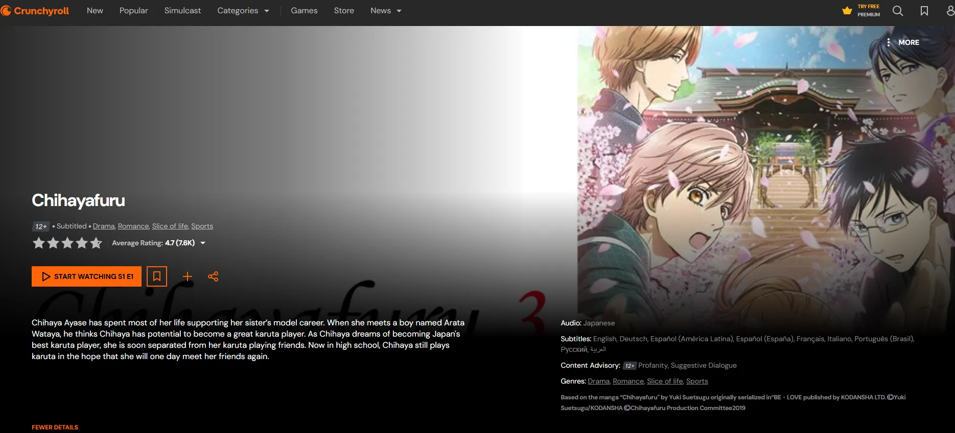 The Premise: Chihaya Ayase, inspired by childhood friend Arata Wataya, discovers her passion for competitive karuta. Determined to become the best, she joins her high school karuta club, recruiting teammates and facing talented rivals. Through countless practice sessions, local and national tournaments, and personal challenges, Chihaya grows as a player and as a person. Alongside her friends and competitors, she experiences the excitement of victory, the lessons of defeat, and the bonds formed through shared passion. The story emphasizes dedication, strategy, and emotional resilience while exploring friendship, ambition, and the pursuit of excellence in an intellectually and emotionally engaging sport.