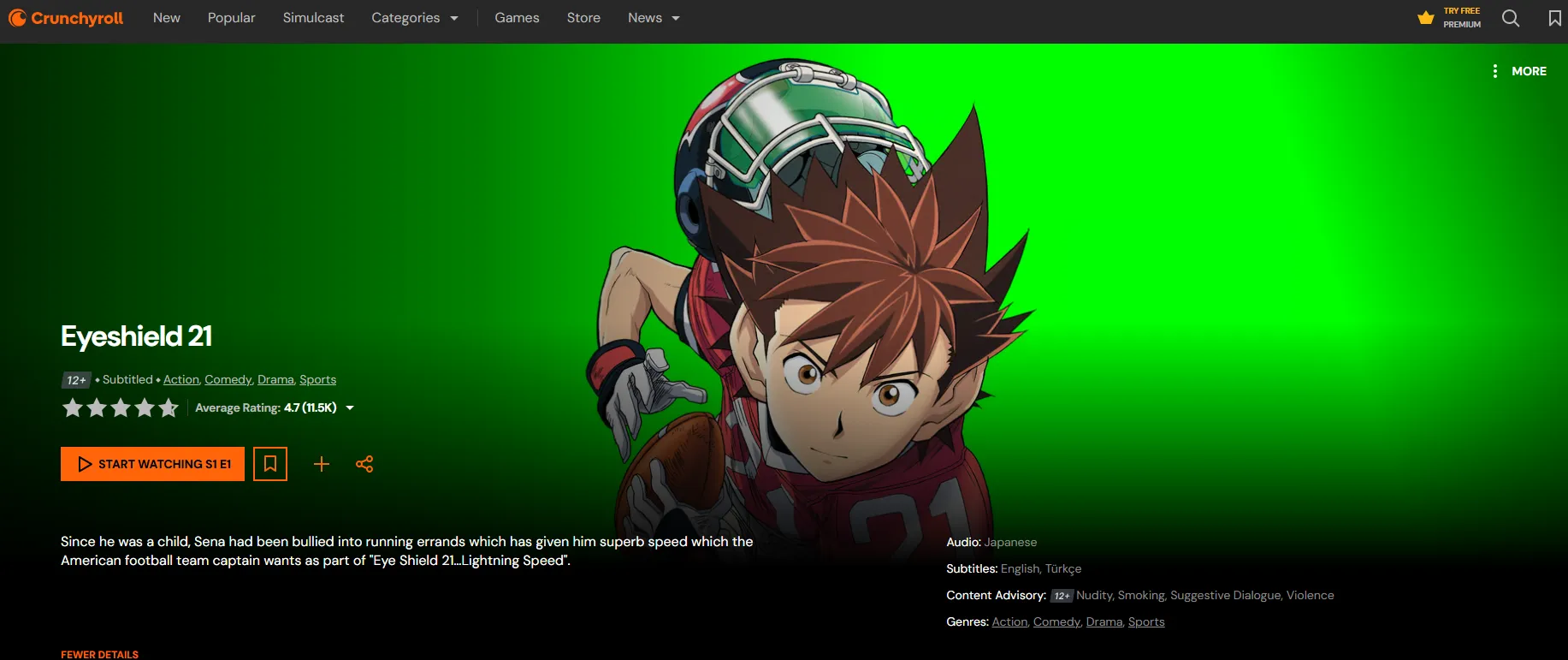 The Premise: Sena Kobayakawa, a timid high school student with incredible speed, is recruited by the Deimon Devil Bats to play American football under the pseudonym “Eyeshield 21.” With the guidance of coach and teammates, Sena learns the rules and strategies of the game, while gradually gaining confidence and skill. The team faces tough opponents in regional and national tournaments, requiring each player to overcome personal challenges and grow both individually and collectively. The series highlights teamwork, determination, and the thrill of competition, following Sena’s journey from an unnoticed student to a key player leading his team toward victory.