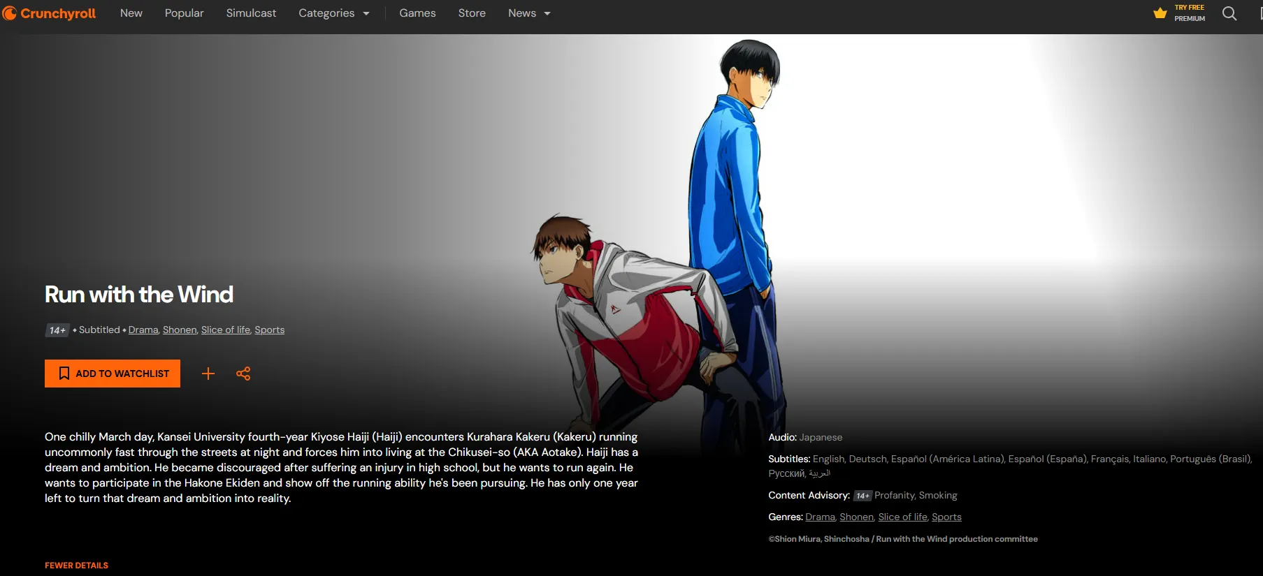 The Premise: Kakeru Kurahara, a former elite runner, is convinced by Haiji Kiyose, a spirited upperclassman, to join a university long-distance relay team for the prestigious Hakone Ekiden race. Alongside a group of misfit runners with diverse abilities and backgrounds, Kakeru must train rigorously, face personal limitations, and learn to synchronize with his teammates. The story follows the team’s journey as they prepare for the ultimate relay challenge, highlighting the physical demands of the sport, emotional bonds formed through training, and the personal growth that comes from striving for excellence together.