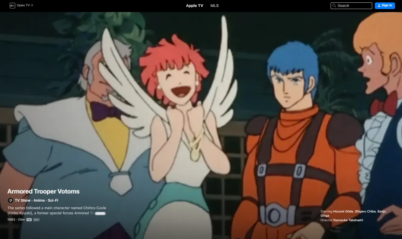 | 1983 | Armored Trooper VOTOMS | The "Old Testament" of AC. Disposable mecha and gritty mercenary survival. | Apple TV | 7.69 |