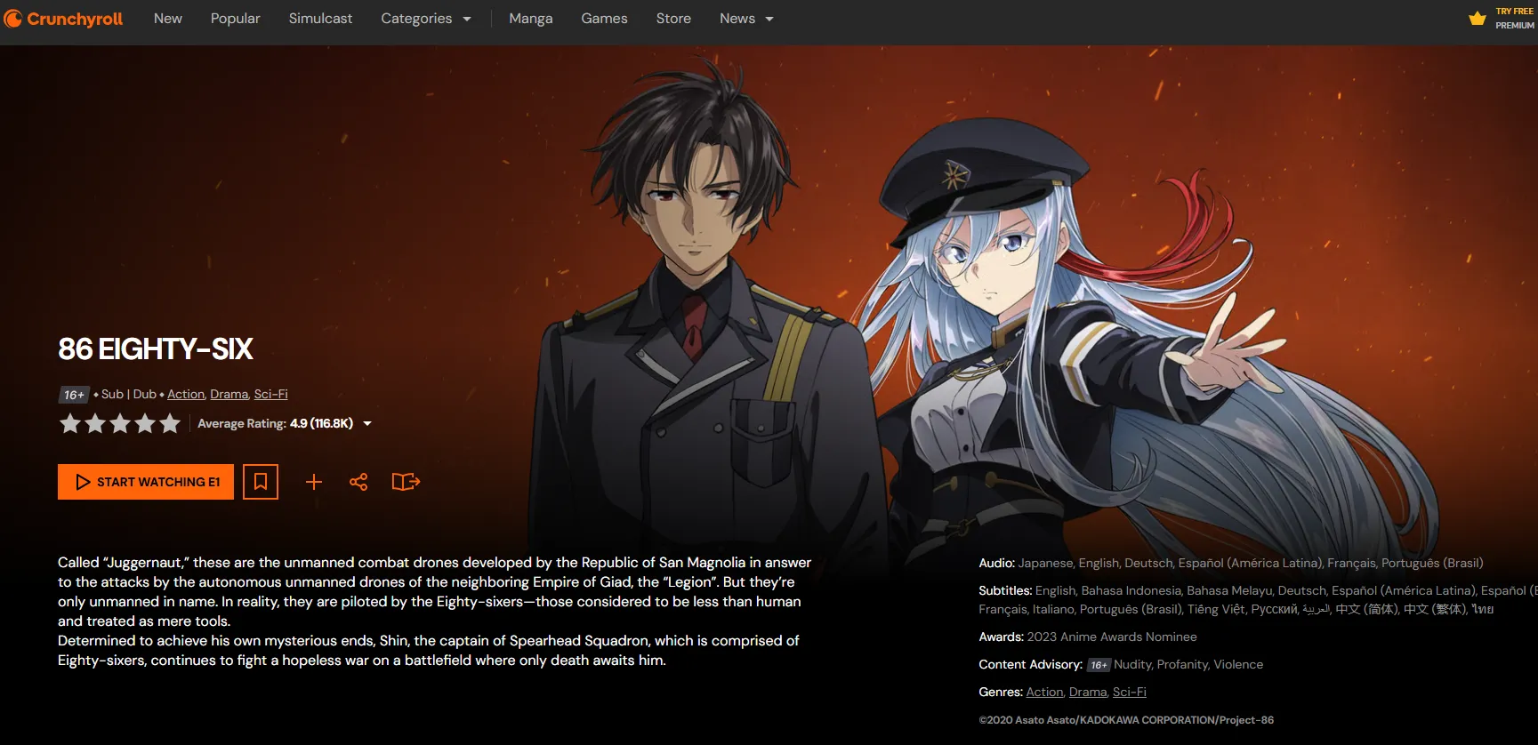 | 2021 | 86 EIGHTY-SIX | Masterpiece on racial oppression and tactical drone warfare. | Crunchyroll | 8.34 |