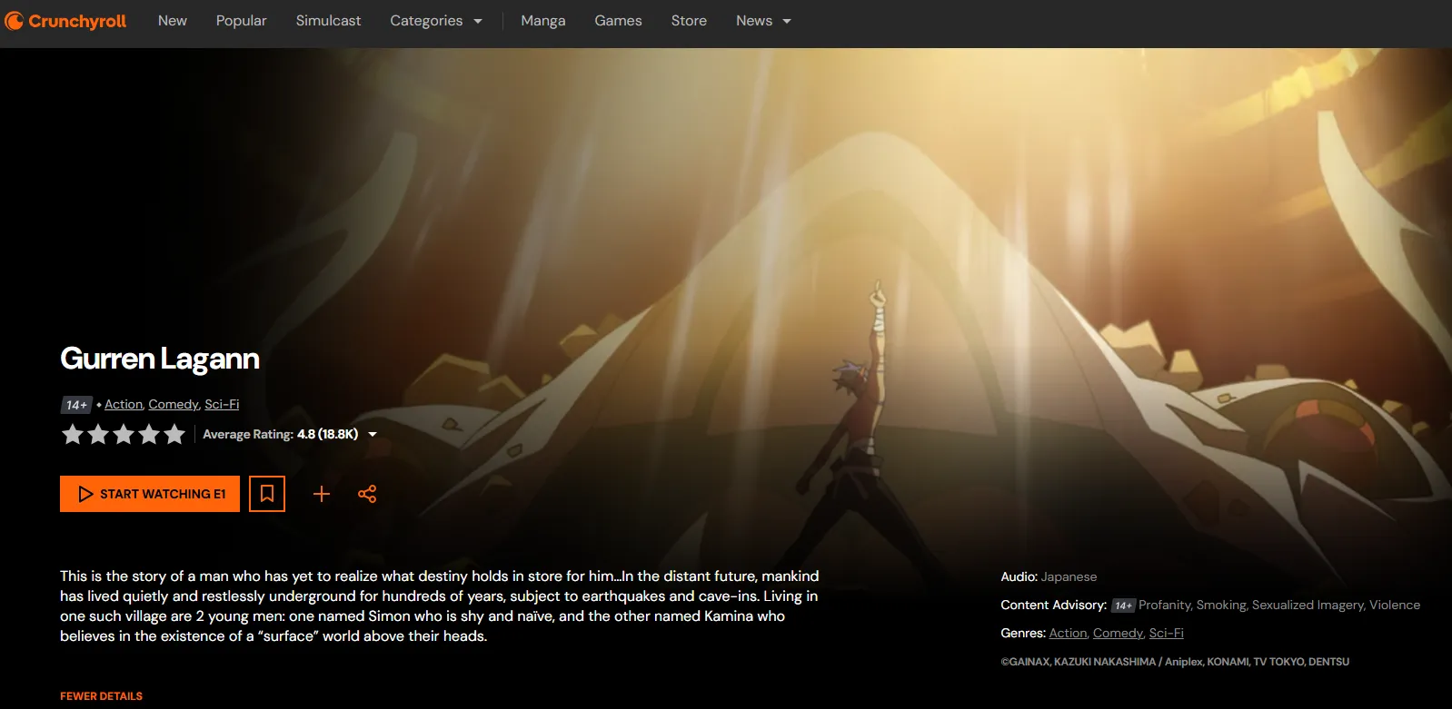 | 2007 | Gurren Lagann | The "active" response to Eva. Uses "Spiral Power" to smash nihilism. | Netflix & Crunchyroll | 8.64 |