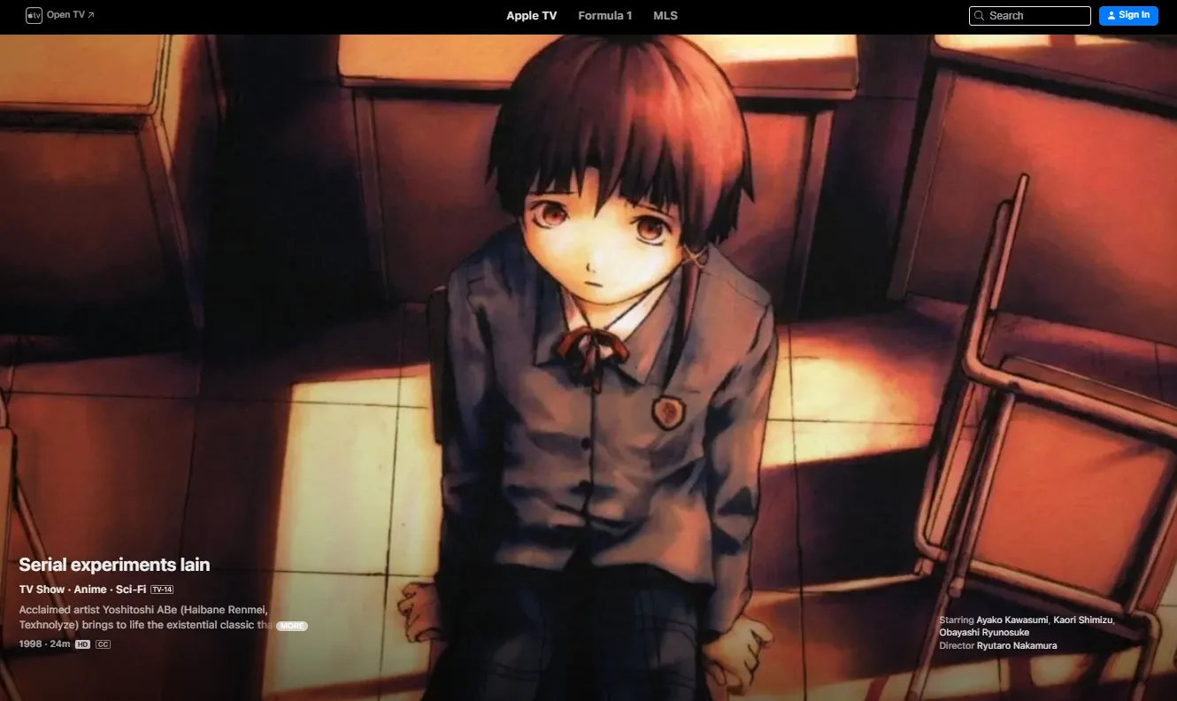 | 1998 | Serial Experiments Lain | Explores the psychological wall between the physical and digital self. | Apple TV | 8.10 |
