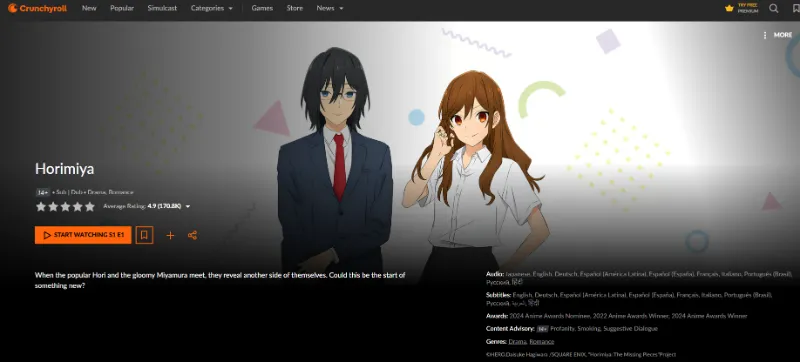 | Horimiya | The gold standard for wholesome school romance. Fast-paced, genuine relationship development between a popular girl and an introverted boy. | Crunchyroll, Netflix | 4.9 (170.8k) |