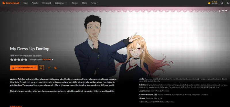 | My Dress-Up Darling | Sweet and surprisingly wholesome. An otaku boy who makes Hina dolls and a popular girl who loves cosplay partner up, leading to high-sugar romance. | Crunchyroll, Netflix | 4.9 (226k) |