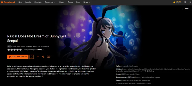 | Rascal Does Not Dream of Bunny Girl Senpai | Deep storylines and emotionally intelligent romance. A unique blend of fantasy and romance, solving psychological problems while developing relationships. | Crunchyroll, Netflix, Hulu | 4.8 (94.8k) |