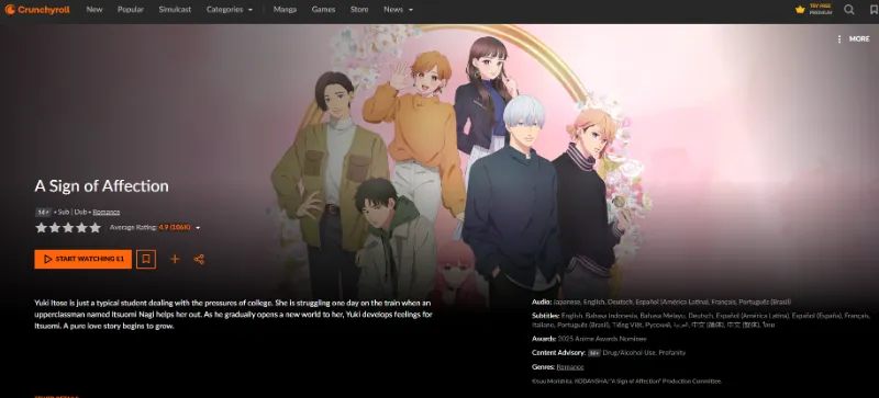 | A Sign of Affection | Aesthetic and pure. A beautiful, gentle romance between a deaf college student and a highly observant, globe-trotting senior. Visually stunning. | Crunchyroll, Netflix, Hulu | 4.9 (106k) |