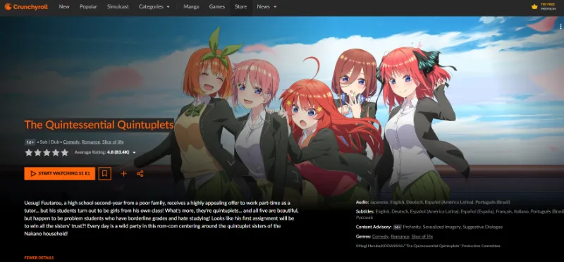 | The Quintessential Quintuplets | Harem mystery/comedy. A romantic story about a boy and five sisters, exploring complex relationships. | Crunchyroll, Netflix, | |