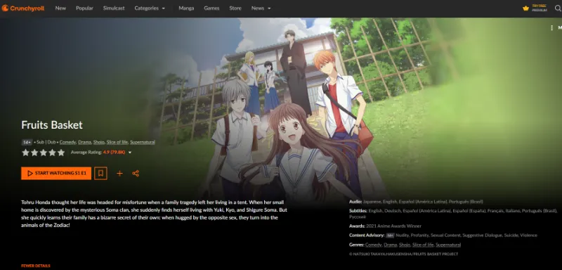 | Fruits Basket | Healing and profound. A story of empathy, trauma, and love, as a kind girl helps the cursed Sohma family break free from their bonds. | Crunchyroll, Netflix, Hulu | 4.9 (79.8k) |