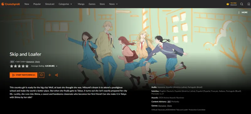 | Skip and Loafer | A refreshing and heartwarming youth ensemble drama. A romantic story about a rural girl and a city boy, filled with growth and charm. | Crunchyroll, Netflix | 4.8 (40.8k) |