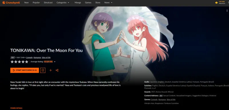 | Tonikawa: Over The Moon For You | Highest sugar content comedy. A romance that starts immediately with marriage; incredibly sweet with no major drama. | Crunchyroll ,Netflix | 4.8 (69.4k) |